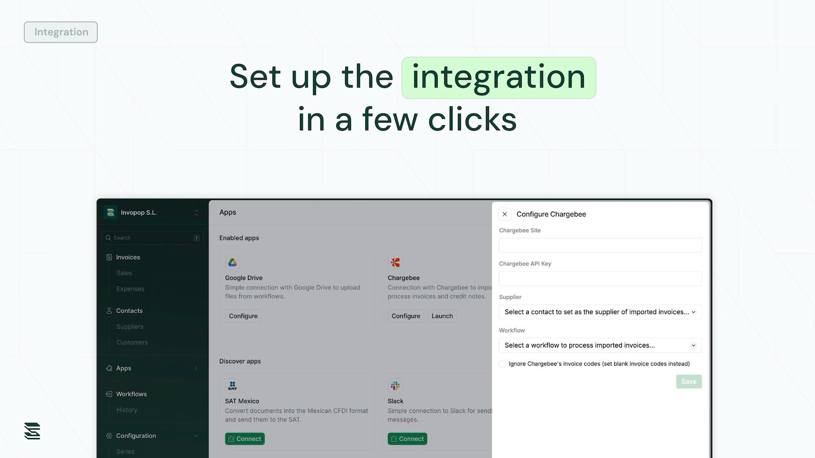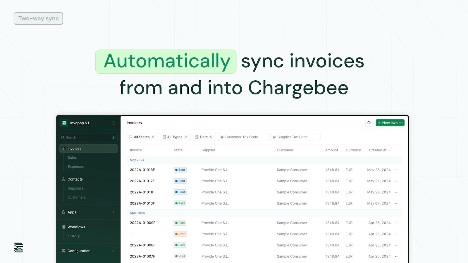 Invopop ensures your invoices comply with local fiscal regulations worldwide. Our Chargebee integration seamlessly syncs every invoice and credit note, converting them into the required format—whether it’s e-invoices or fiscalized PDFs—and reports them to the appropriate tax authority or invoice network. All of this happens automatically, without leaving your Chargebee environment.