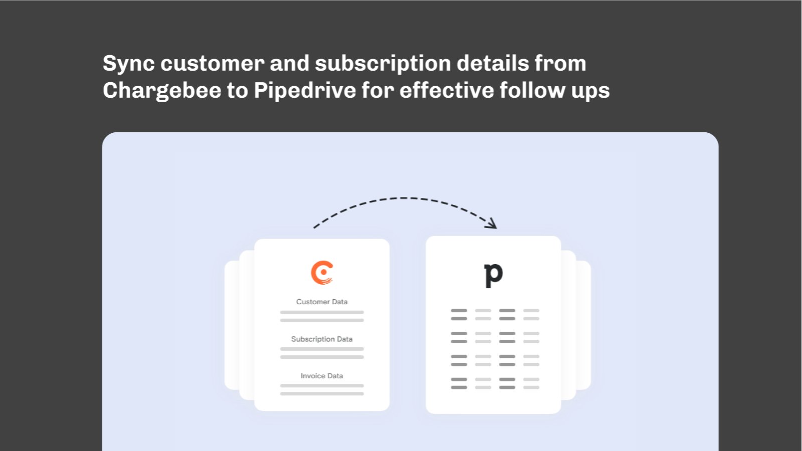 Chargebee’s integration with Pipedrive ensures that you can enrich contacts in the CRM with critical subscription data including subscription, invoice, customer and company details.